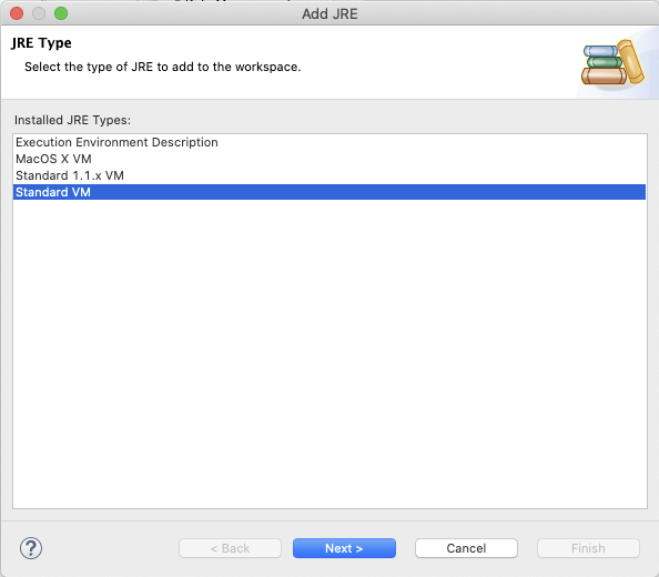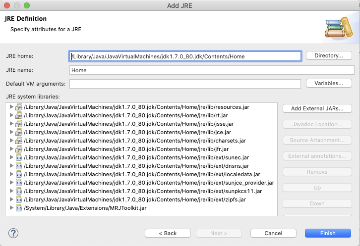 [Directory] 선택후 Contents/Home 까지 선택하면 라이브러리 리스트가 뜨는것을 볼수 있다. [Finish] 선택