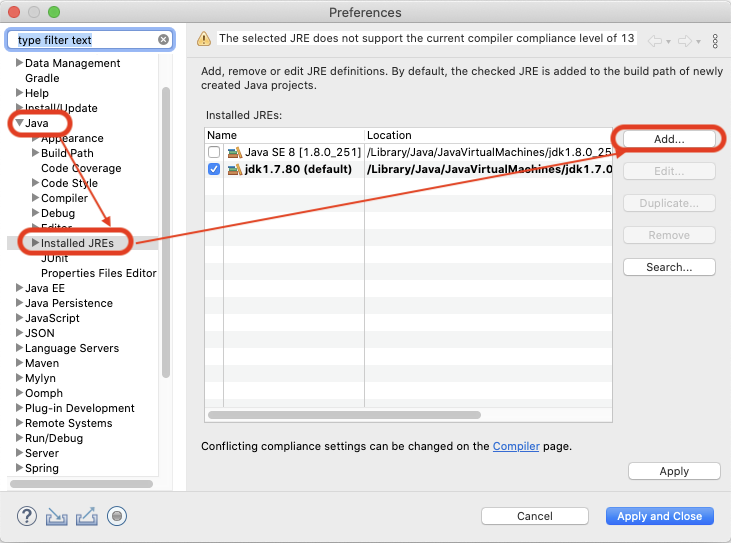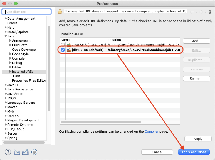 변경하고자 하는 jdk를 체크 후 [Apply and Close] 선택한다.